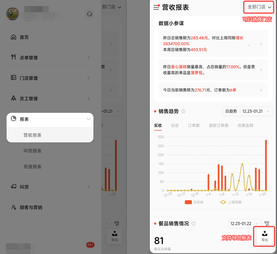 导出路径:RMSapp - 报表 - 营收报表 - 右下角【导出】- 选择【餐品销量情况】。
