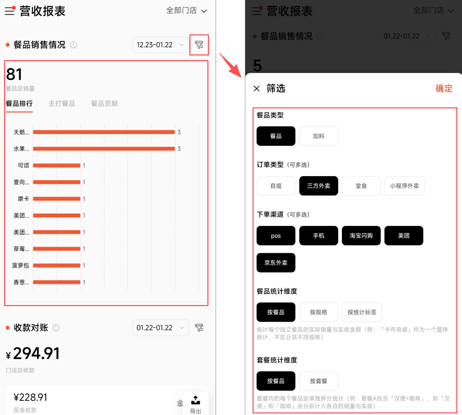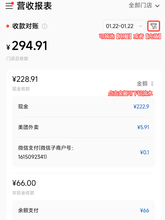 2.当天有订单是昨天部分支付,今天支付了剩余部分,【收款】会统计今天支付的部分金额,【营业收入】统计整单金额。