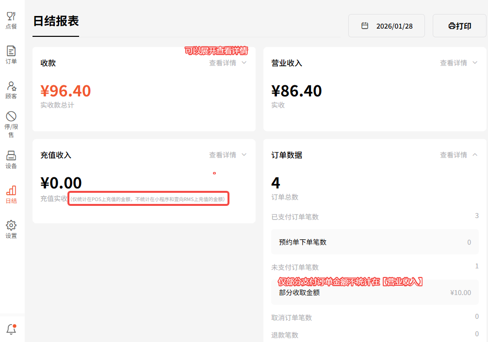 1.当天有订单是部分支付时,【收款】会统计部分支付金额,【营业收入】不统计。