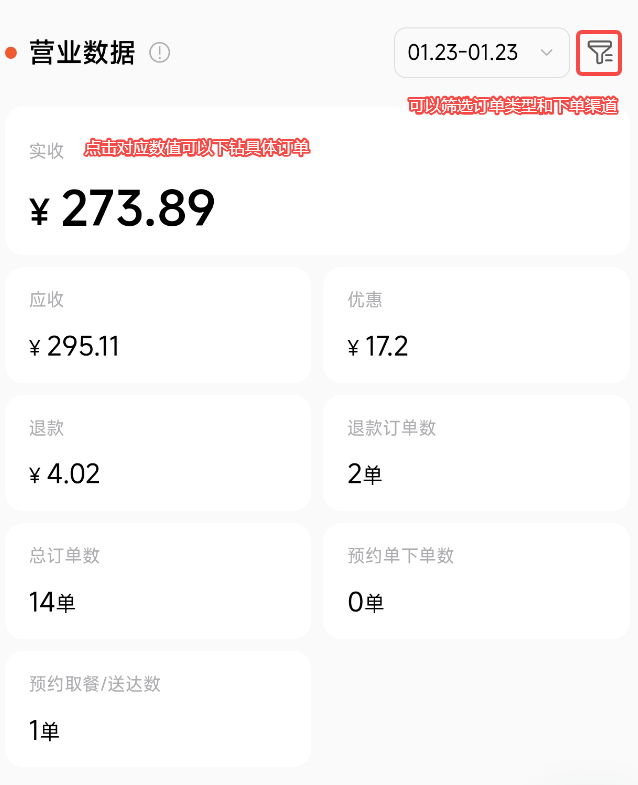 用途:查看某个时段的关键指标(实收、应收、总订单数),方便排班安排人力等