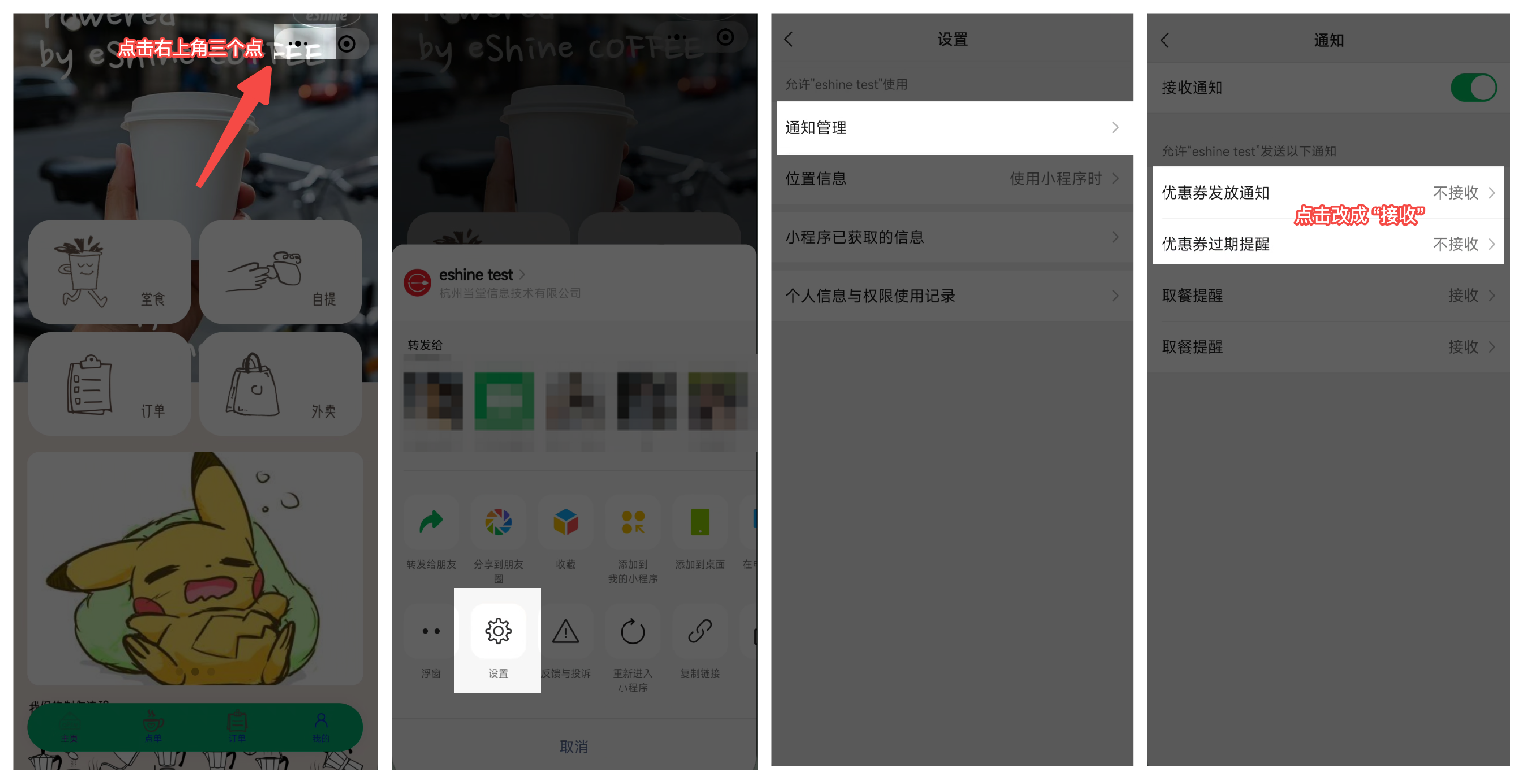 如果顾客之前拒绝接收消息,可以进入小程序 - 点击右上角三个点 - 设置- 通知管理 - 把相关通知改成“接收”