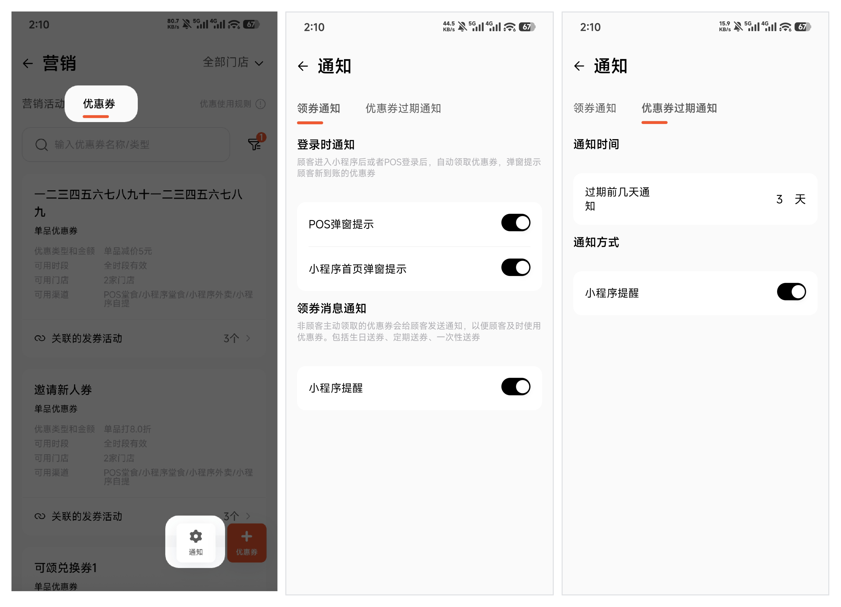 【优惠券过期通知】可以设置过期前几天通知,通知方式仅支持小程序提醒。