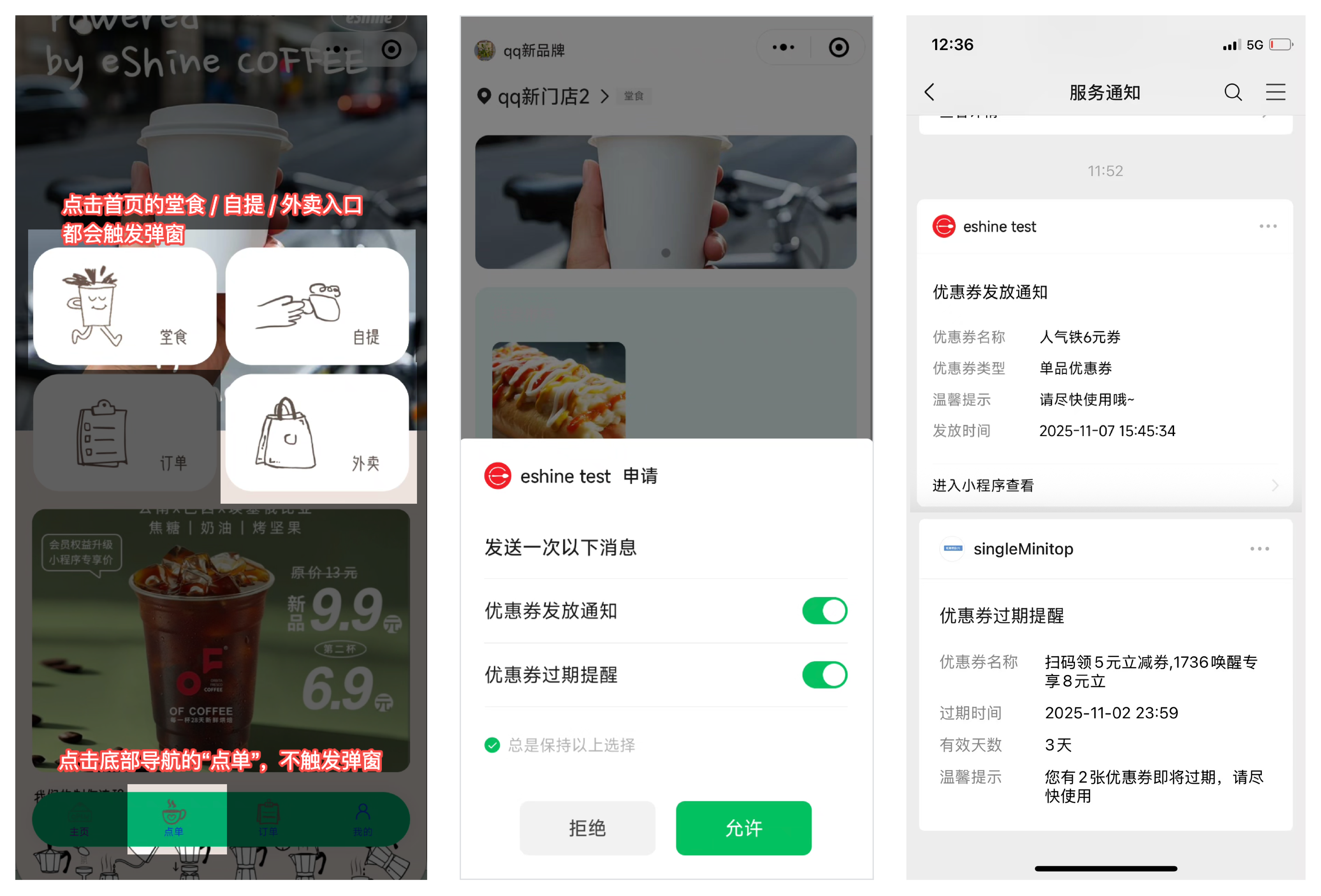 优惠券发放通知:非顾客主动领取的券(如成长体系定期送券、一次性送券、生日送券),才能触发“优惠券发放通知”的小程序消息。如果是顾客主动领取券(如扫码送券、充值送券、集点送券),就不触发小程序领券通知,因为顾客已经知道有这个券