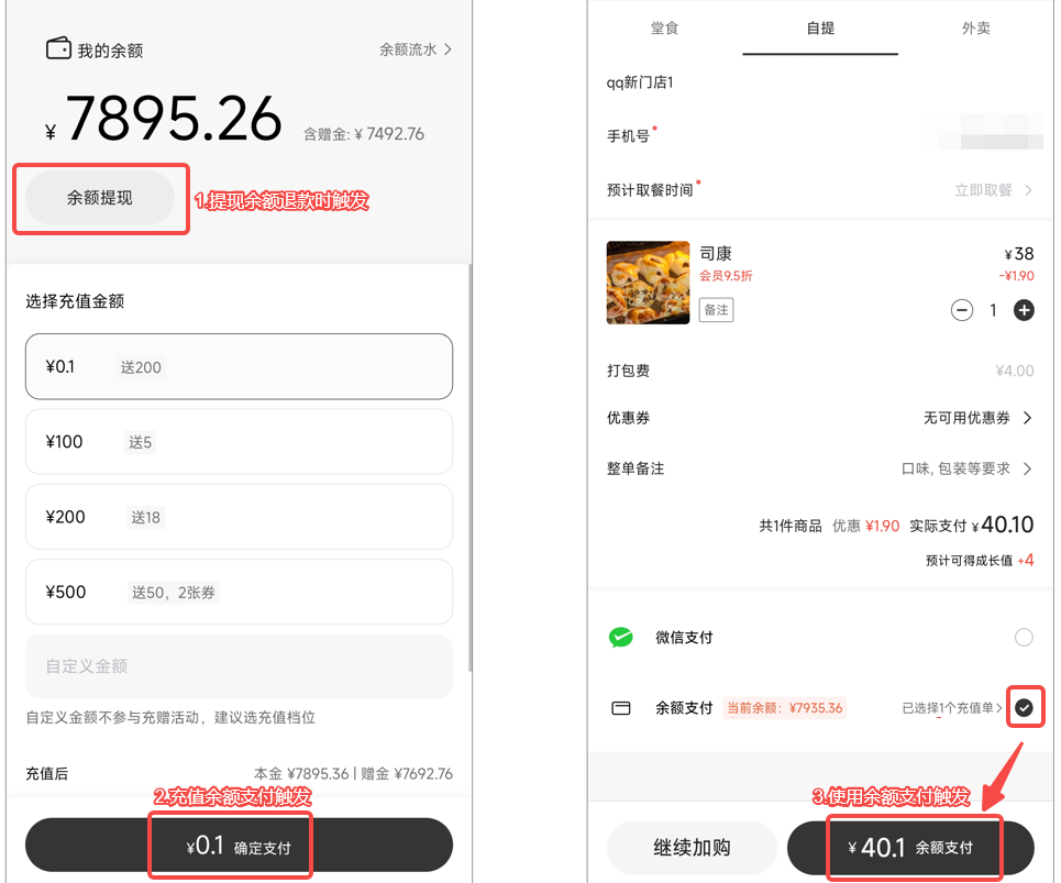 1.提现余额退款时触发;2充值余额支付触发;3.使用余额支付触发