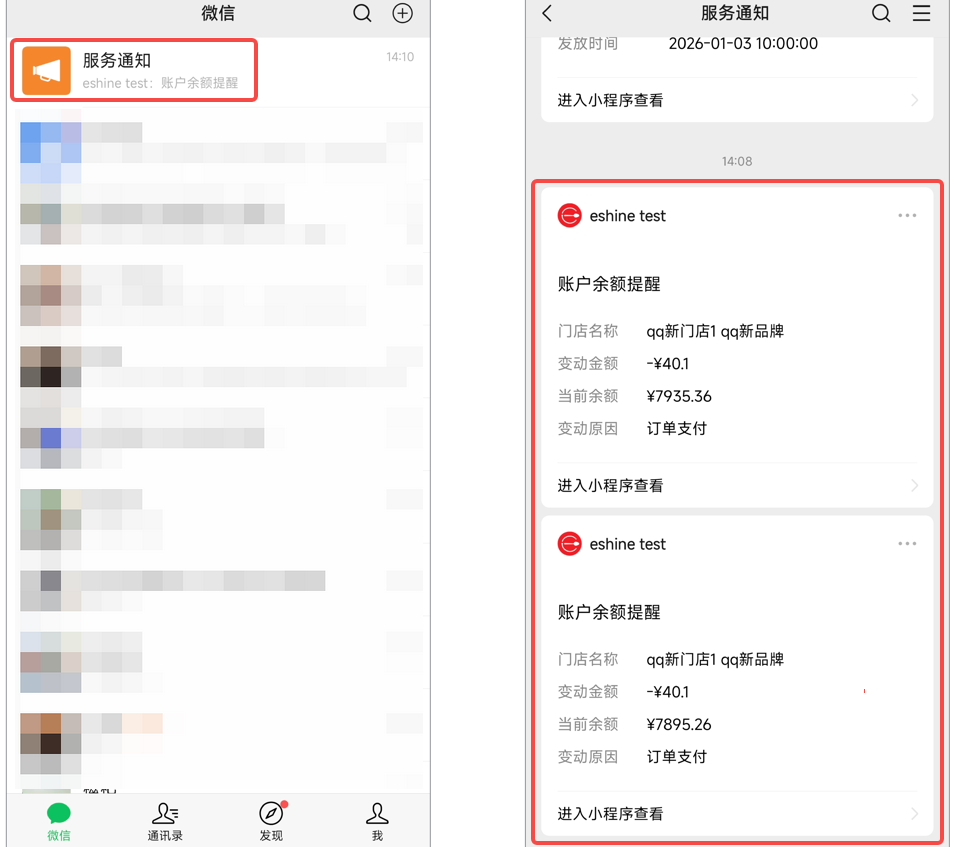 订阅后,余额变动时【服务通知】将收到提醒