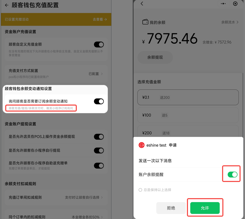 小程序通知订阅逻辑:顾客小程序订阅一次,获得一次接收次数。接收一次余额变动通知,次数消耗一次。订阅次数消耗完后续余额再次变动,将不再收到通知。