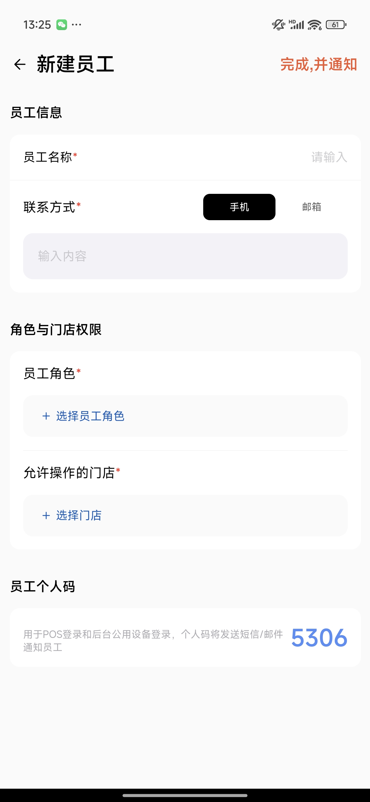 员工角色:选择归属的角色权限。