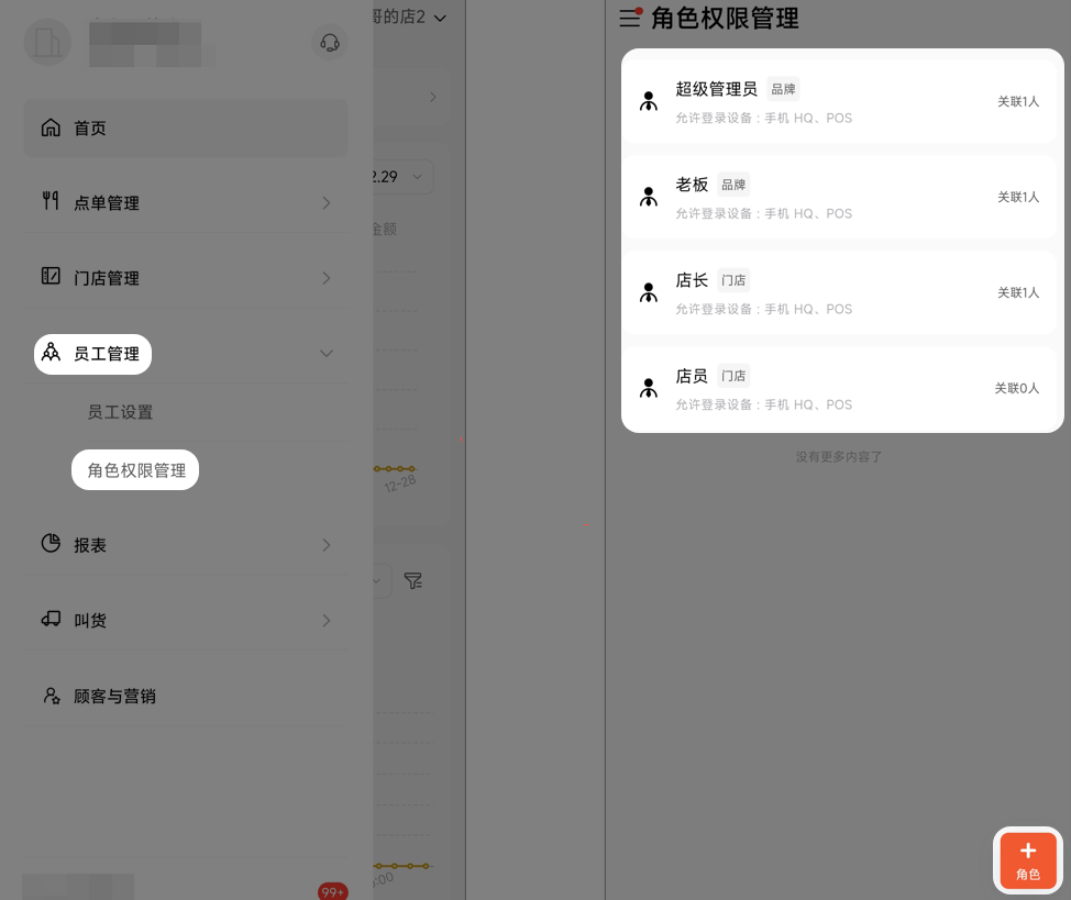其中店长默认手动折扣最大0折,店员默认手动折扣最大8折,若不满足需求可以点击【+角色】添加新角色编辑权限。
