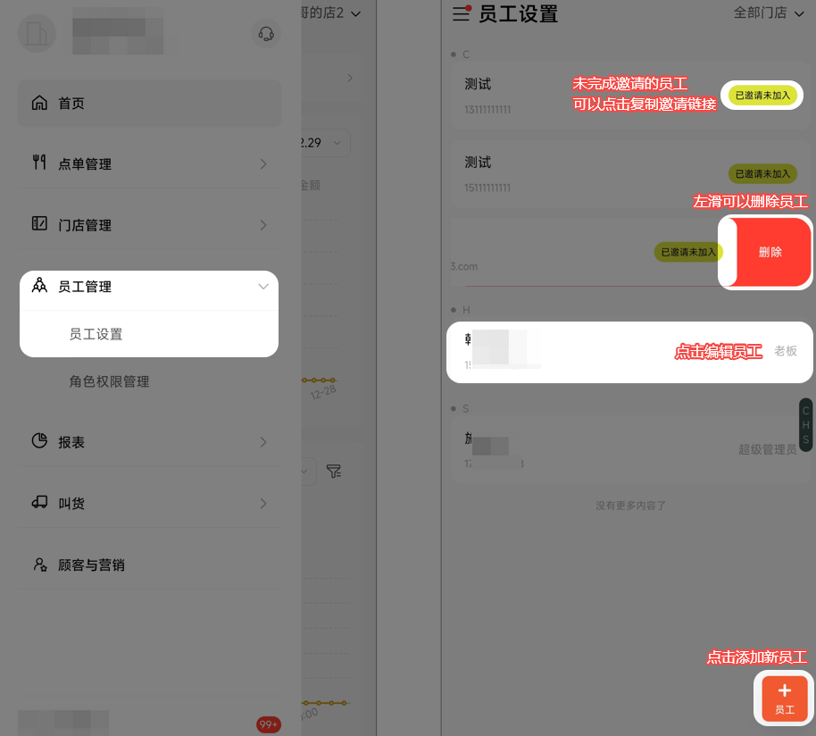 A:壹向RMSapp → 员工管理 → 员工设置 → 左滑员工点击删除