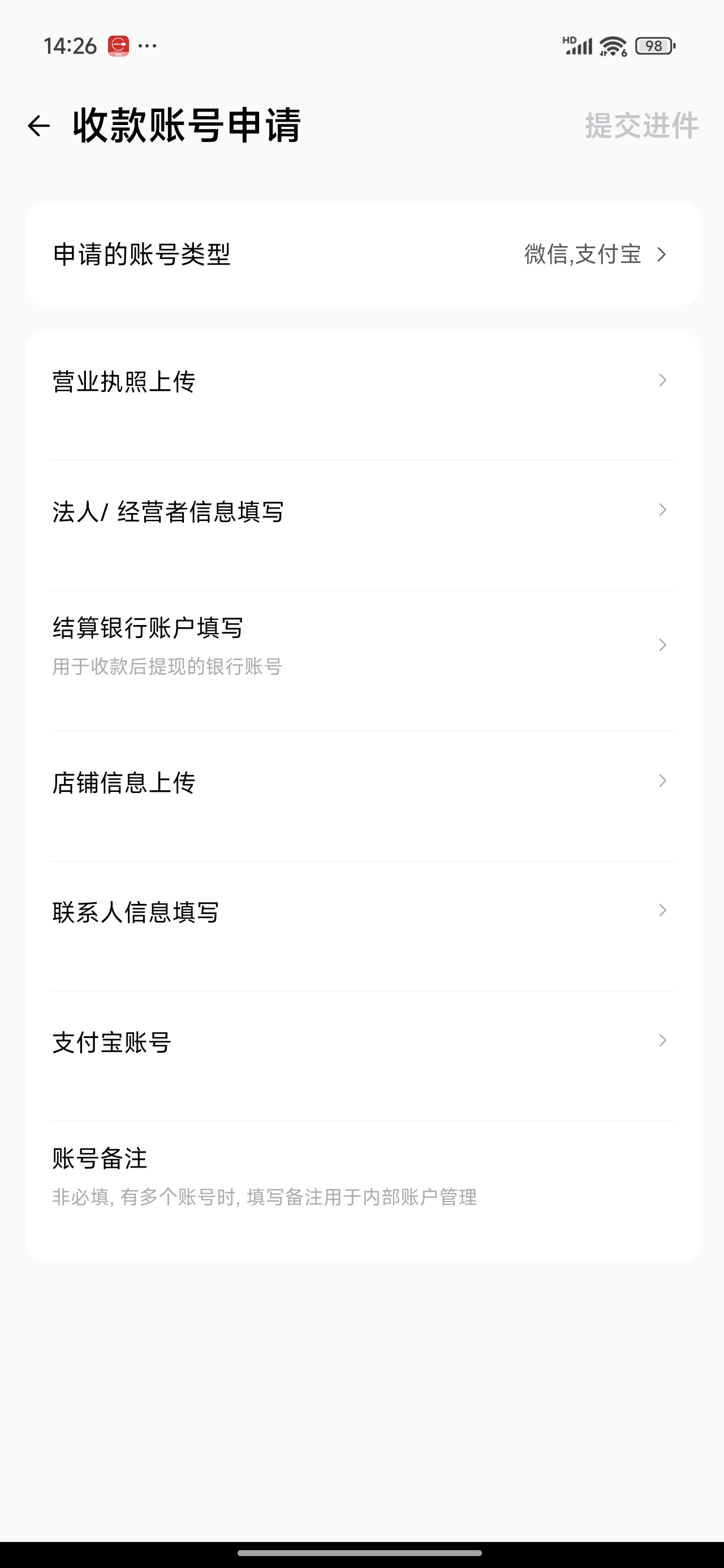 收款账号 - 选择您申请用的营业执照类型,以及提现结算银行卡类型。