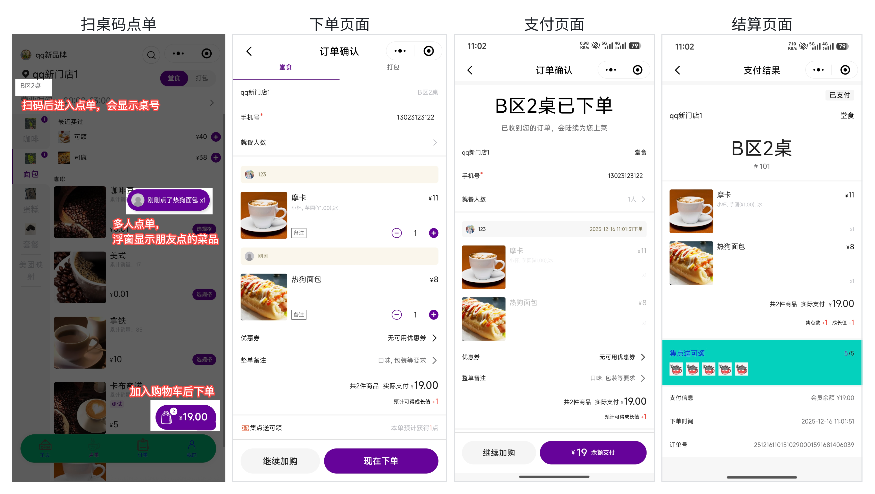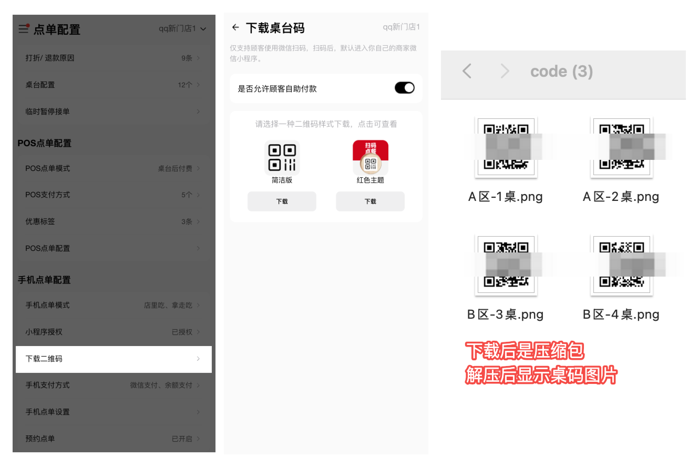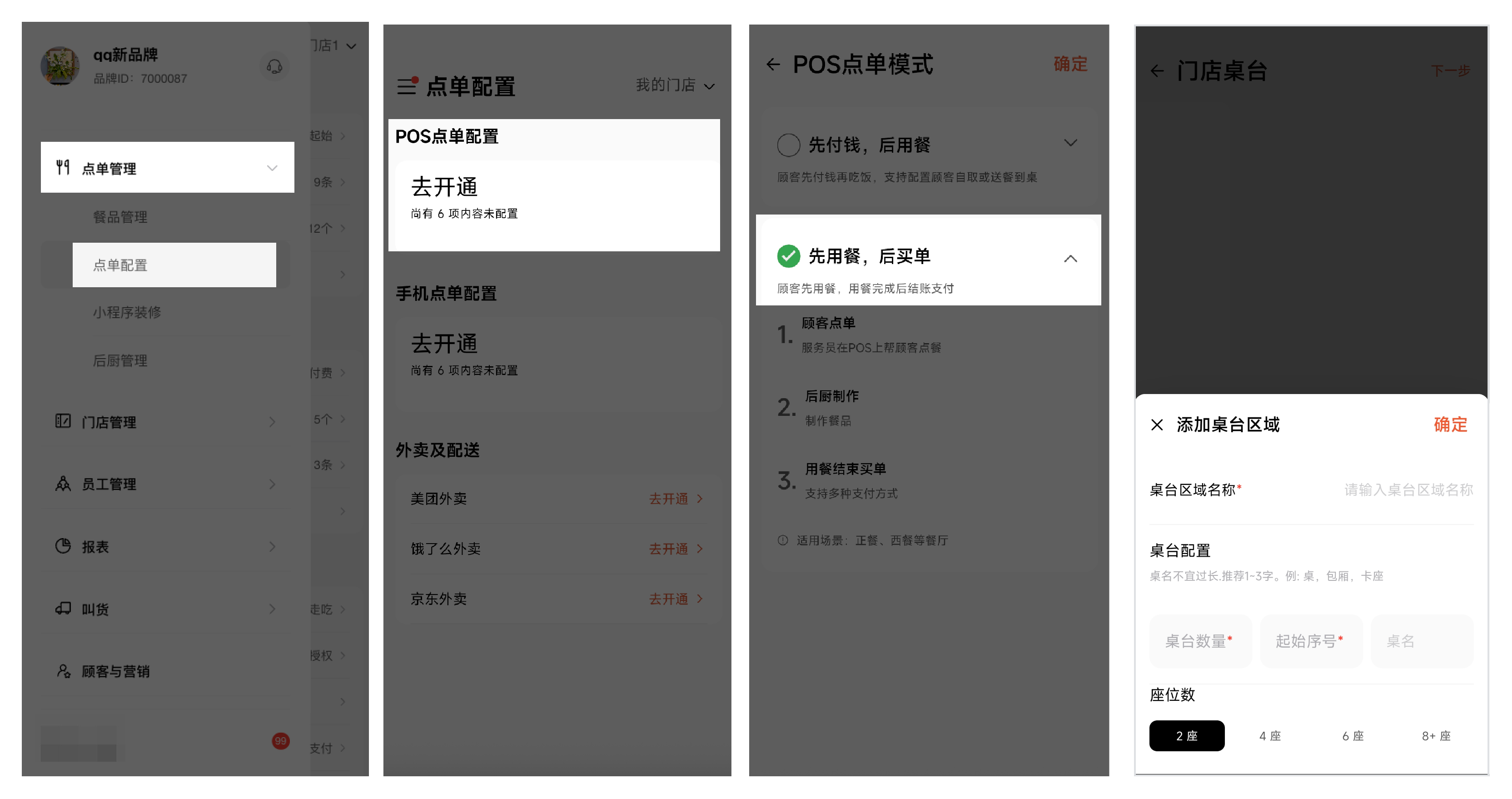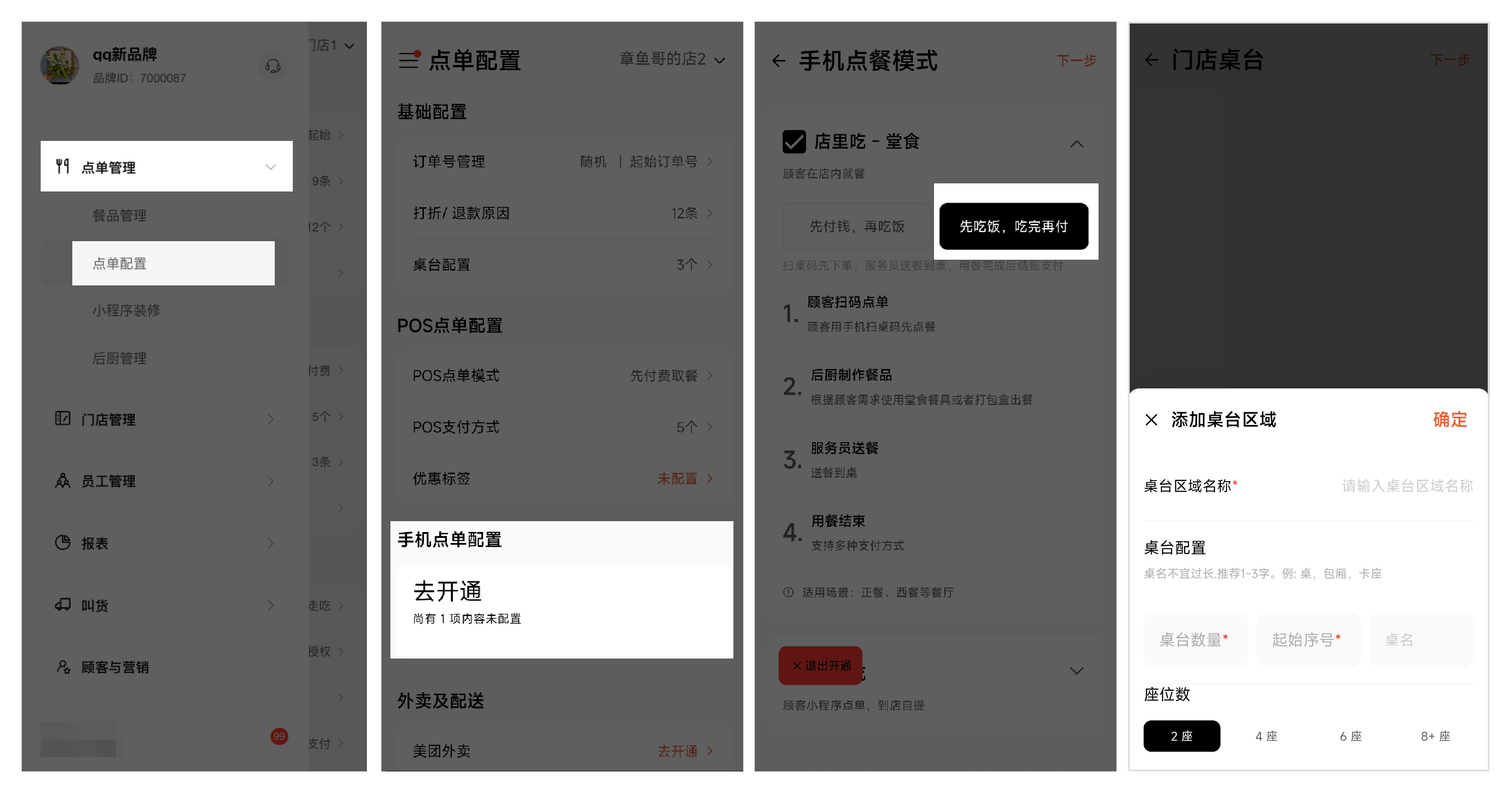 注意:需要先开通手机点单功能,并将手机点单模式设置为“先吃完,吃完再付”或者“先付钱,再吃饭”,取餐方式为“送餐到桌”。