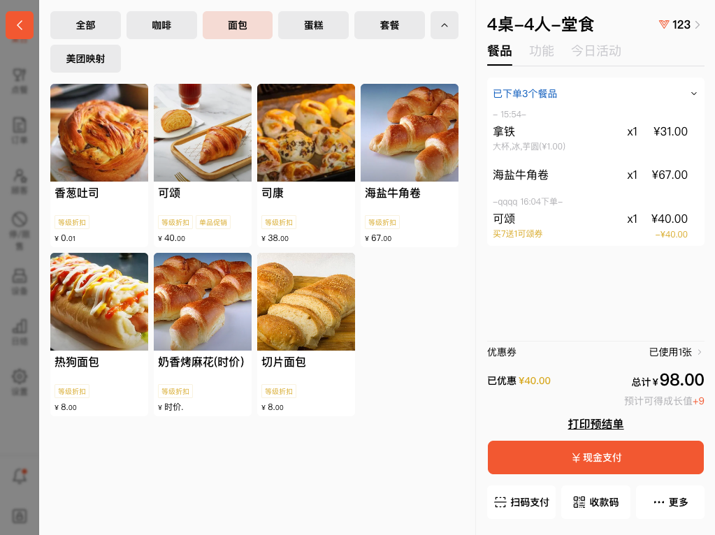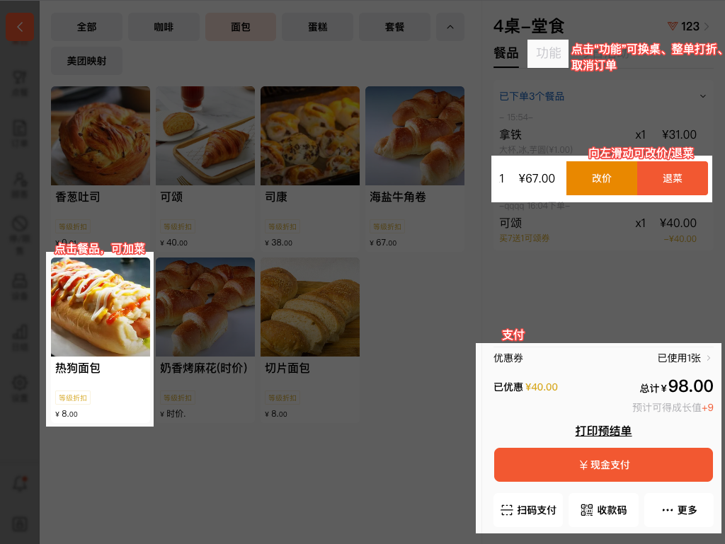 手机下单后,pos上可在桌台查看订单,也可以帮顾客加菜、改价、退菜、打折、结账